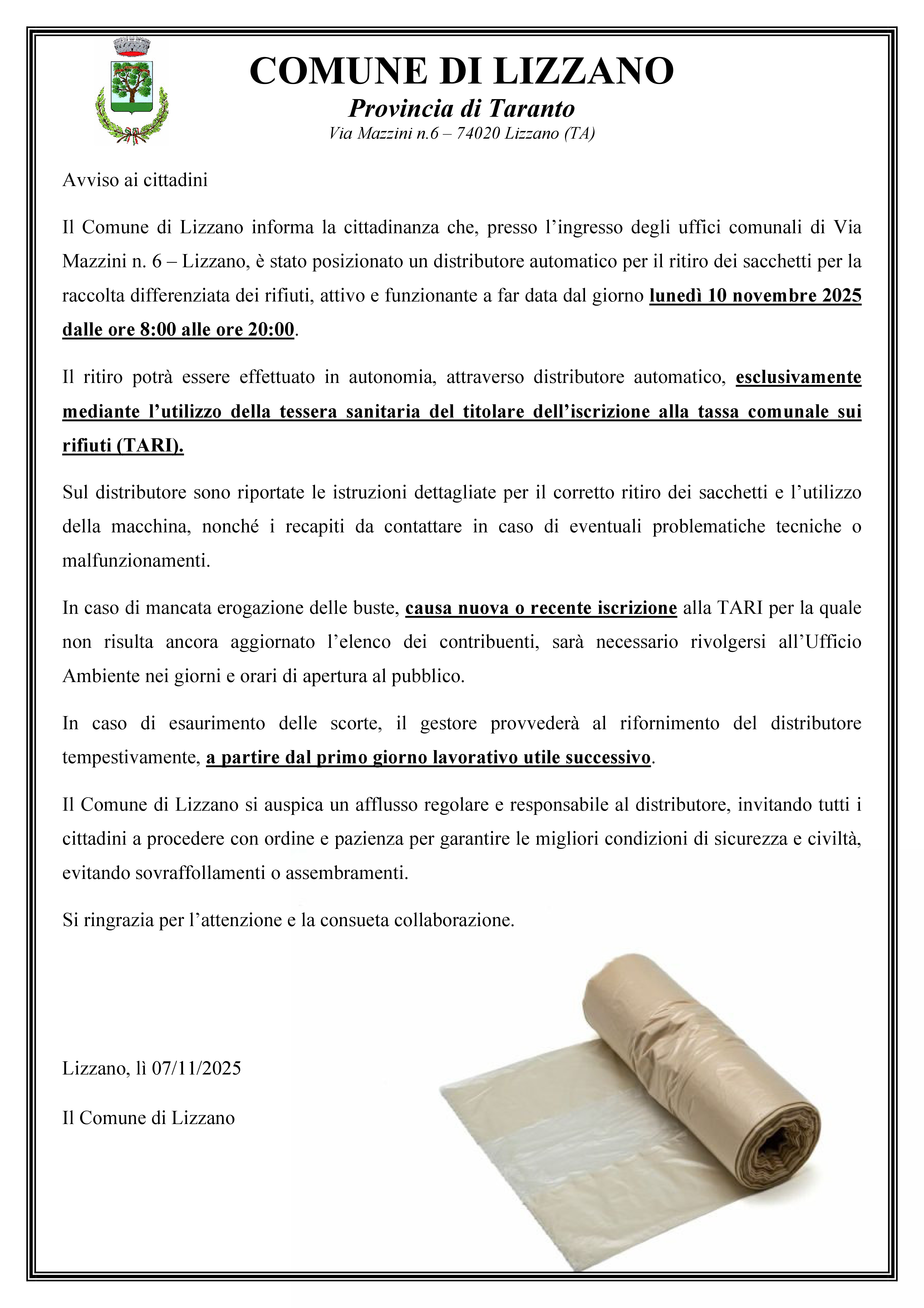 Il Comune di Lizzano informa la cittadinanza che, presso l’ingresso degli uffici comunali di Via Mazzini n. 6 – Lizzano, è stato posizionato un distributore automatico per il ritiro dei sacchetti per la raccolta differenziata dei rifiuti, attivo e funzionante a far data dal giorno lunedì 10 novembre 2025 dalle ore 8:00 alle ore 20:00.