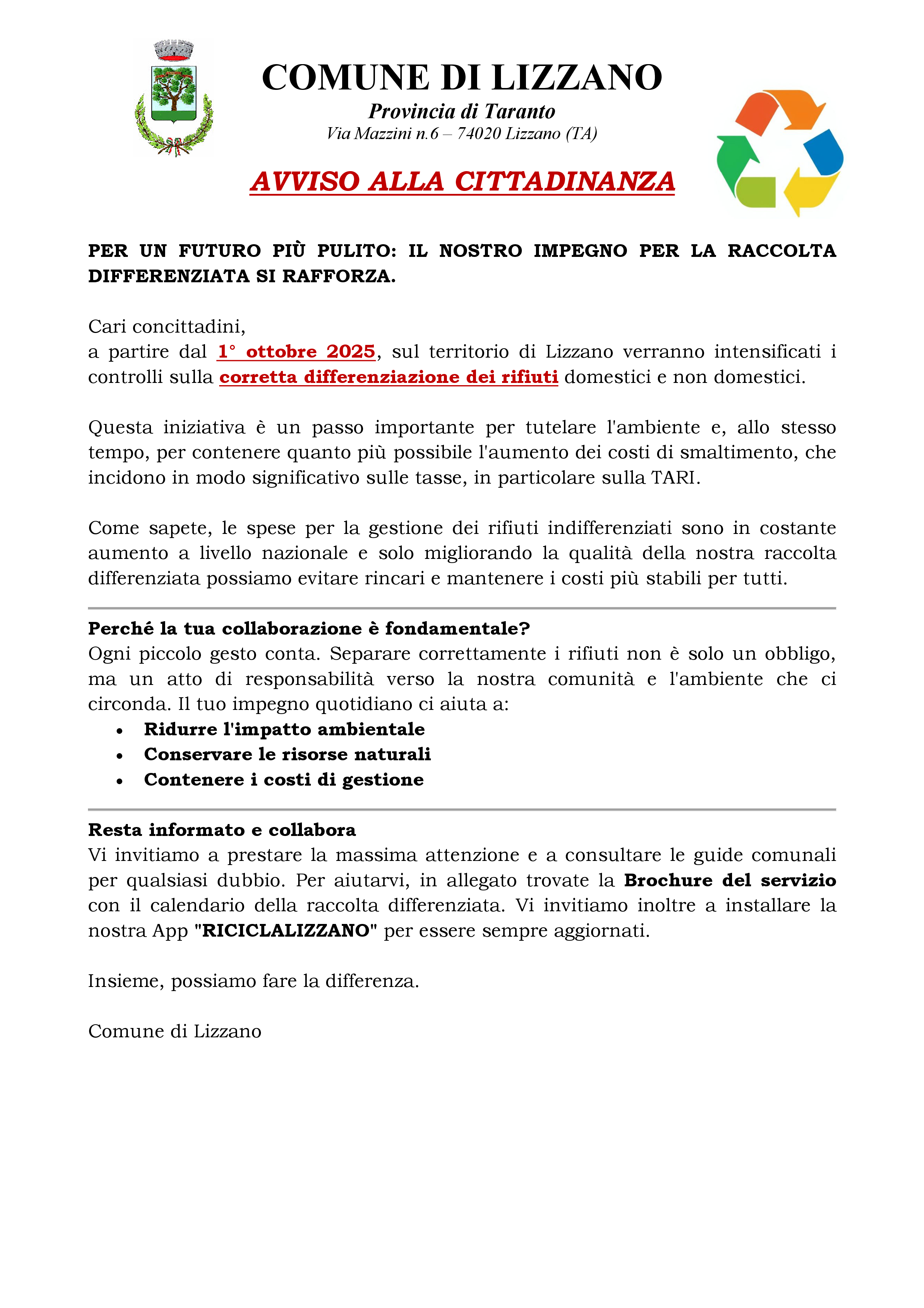 Cari concittadini, a partire dal 1° ottobre 2025, sul territorio di Lizzano verranno intensificati i controlli sulla corretta differenziazione dei rifiuti domestici e non domestici.