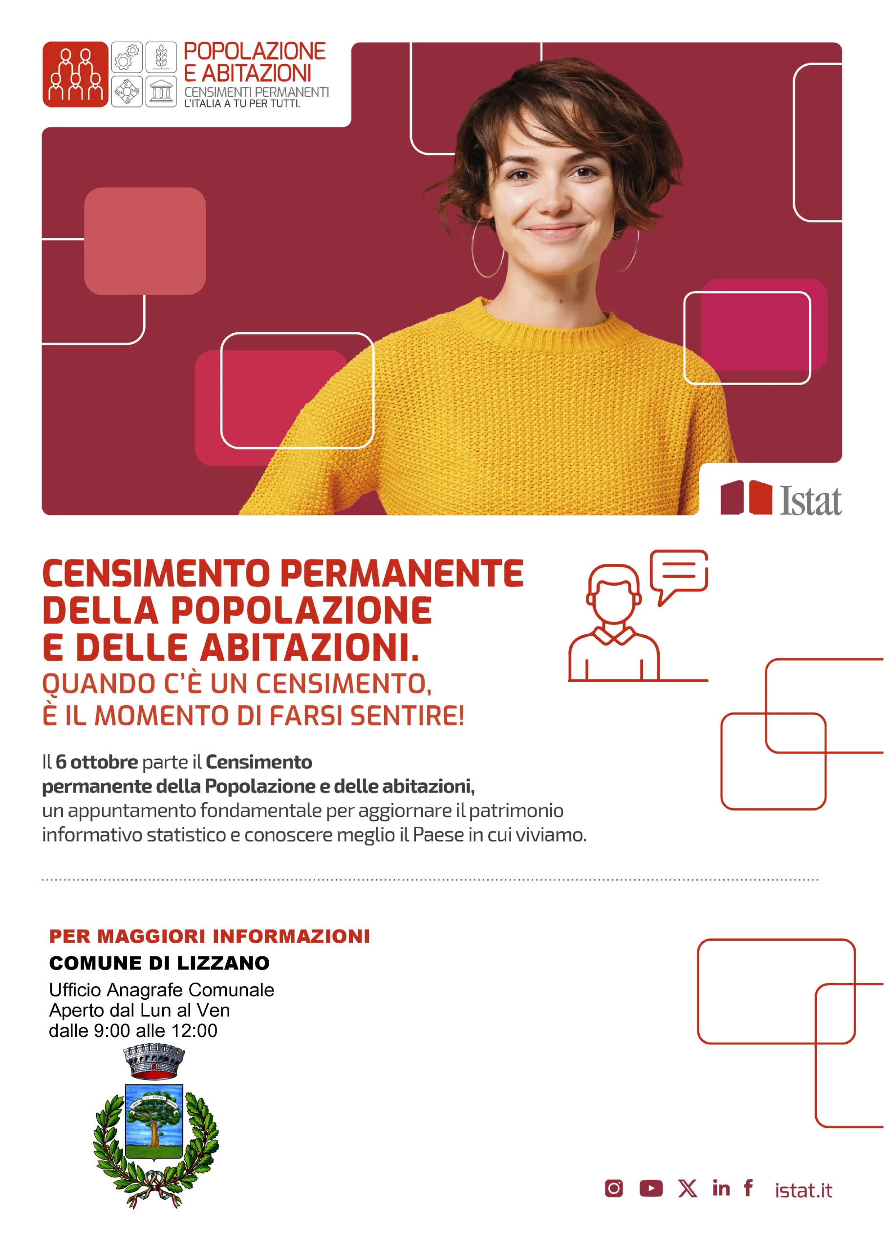 Dal 12 novembre al 23 dicembre 2025 si svolgerà la fase di recupero delle mancate risposte: i rilevatori autorizzati dal Comune di Lizzano visiteranno a domicilio le famiglie che non hanno ancora risposto per condurre direttamente le interviste e completare la raccolta dei questionari mancanti.
