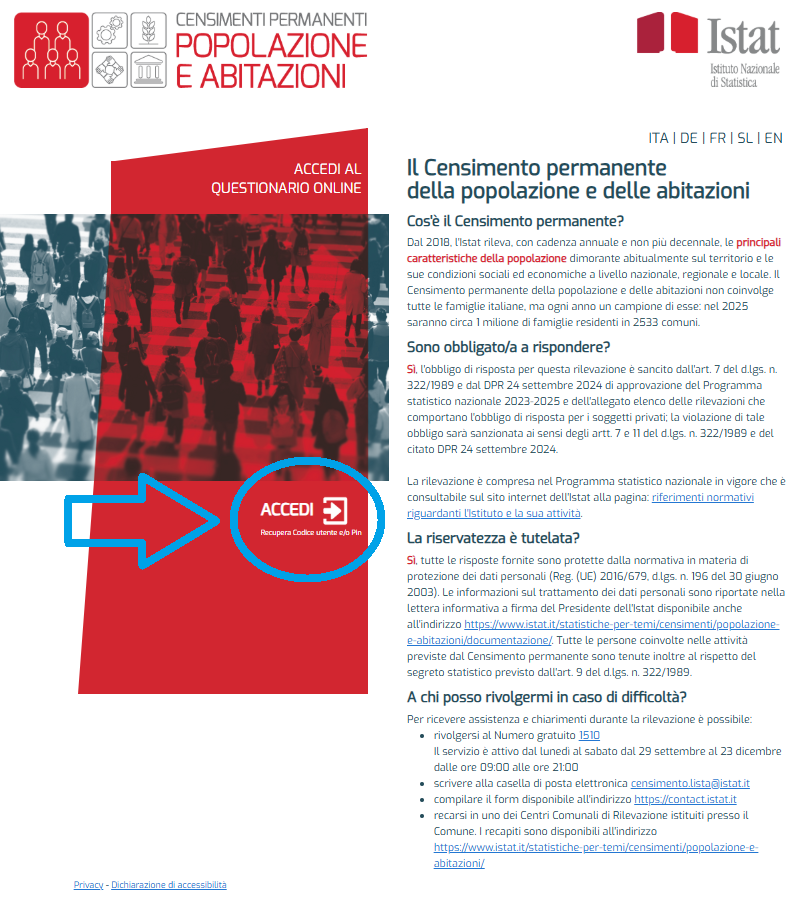 Le famiglie selezionate possono compilare spontaneamente (in autonomia) i questionari online (via WEB) dal 6 ottobre al 9 dicembre 2025. Basterà utilizzare le credenziali di accesso e seguire le istruzioni ricevute con la lettera dell'ISTAT.